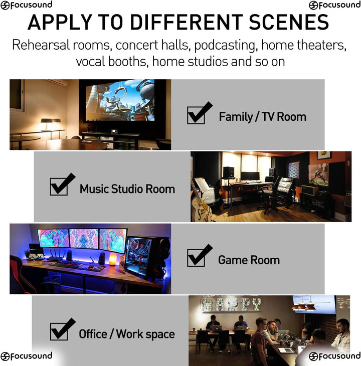 - Versatile Applications: Ideal for targeted sound treatment in studios, offices, and beyond. These panels are also perfect for recording studios, vocal booths, and control rooms, offering a versatile solution for any soundproofing need.